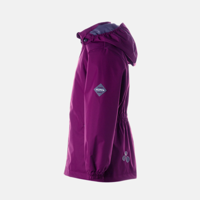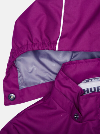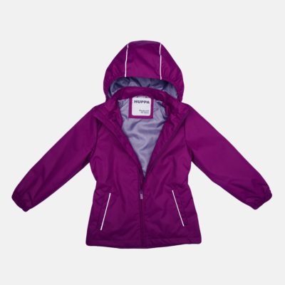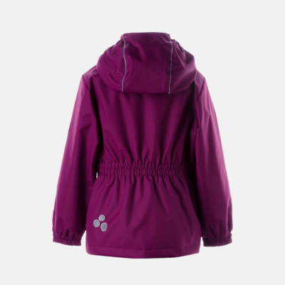 Children´s waterproof and windproof jacket. Breathable outer fabric. Rubber band incorporated in the sleeve ends, hood edge, and back waist. The removable hood attaches to the collar with press studs. Reflective details on the front and back.
