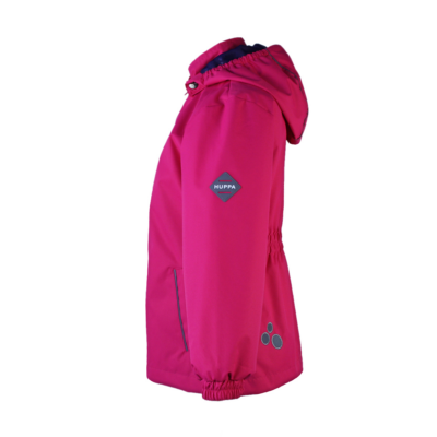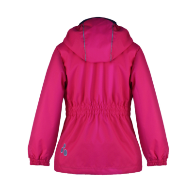 Children´s waterproof and windproof jacket. Breathable outer fabric. Rubber band incorporated in the sleeve ends, hood edge, and back waist. The removable hood attaches to the collar with press studs. Reflective details on the front and back.
