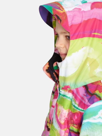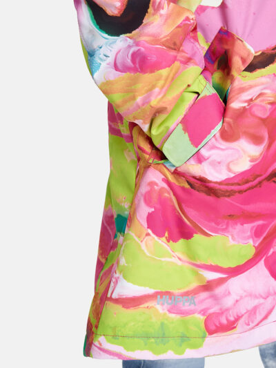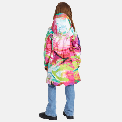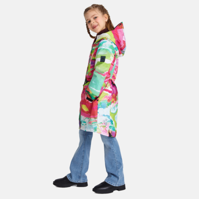 Insulated (40 g) water- and windproof parka for girls, suitable for spring and autumn. The top layer of the parka is made of a breathable material. It has an adjustable hood and sleeve ends, as well as an adjustable waist with stoppers. It has waterproof, taped seams and is decorated with reflective details.