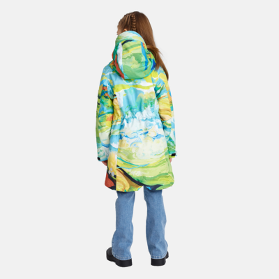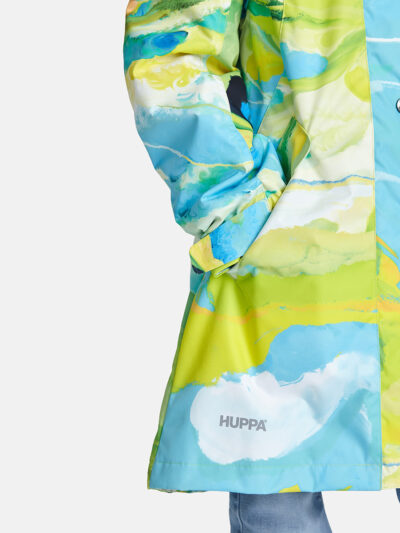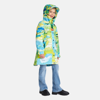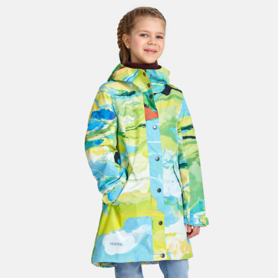 Insulated (40 g) water- and windproof parka for girls, suitable for spring and autumn. The top layer of the parka is made of a breathable material. It has an adjustable hood and sleeve ends, as well as an adjustable waist with stoppers. It has waterproof, taped seams and is decorated with reflective details.