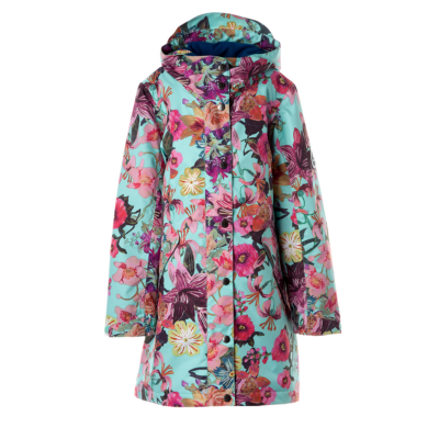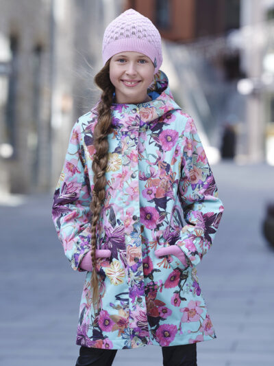 Insulated (40 g) water- and windproof parka for girls, suitable for spring and autumn. The top layer of the parka is made of a breathable material. It has an adjustable hood and sleeve ends, as well as an adjustable waist with stoppers. It has waterproof, taped seams and is decorated with reflective details.