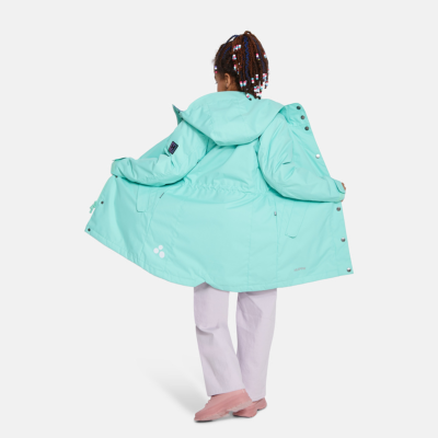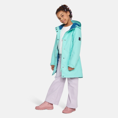 Insulated (40 g) water- and windproof parka for girls, suitable for spring and autumn. The top layer of the parka is made of a breathable material. It has an adjustable hood and sleeve ends, as well as an adjustable waist with stoppers. It has waterproof, taped seams and is decorated with reflective details.