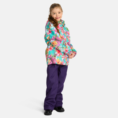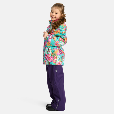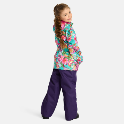 Children´s transition season jacket and pants set. Water- and windproof, breathable outer fabric. The inside of the jacket and trousers is made of soft lining fabric. Rubber band incorporated in the sleeve ends, hood edge, and back waist. The removable hood attaches to the collar with press studs. The trousers have a higher waist and adjustable elastic braces. incorporated rubber waistband. Rubber band tunnel with stoppers at the ends of the legs. Waterproof taped seat seam. The pants have no inseam on the leg. Both jackets and trousers have reflective details.