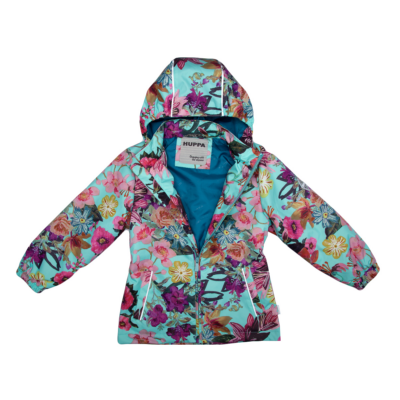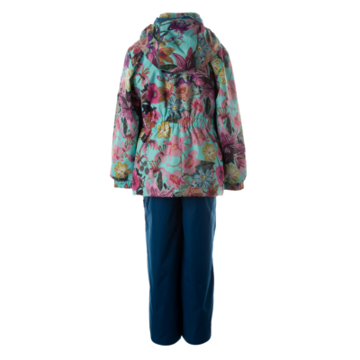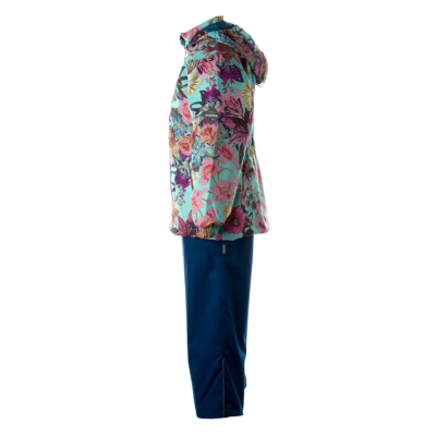 Children´s transition season jacket and pants set. Water- and windproof, breathable outer fabric. The inside of the jacket and trousers is made of soft lining fabric. Rubber band incorporated in the sleeve ends, hood edge, and back waist. The removable hood attaches to the collar with press studs. The trousers have a higher waist and adjustable elastic braces. incorporated rubber waistband. Rubber band tunnel with stoppers at the ends of the legs. Waterproof taped seat seam. The pants have no inseam on the leg. Both jackets and trousers have reflective details.