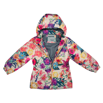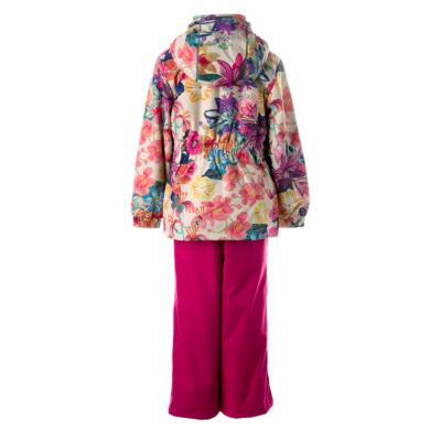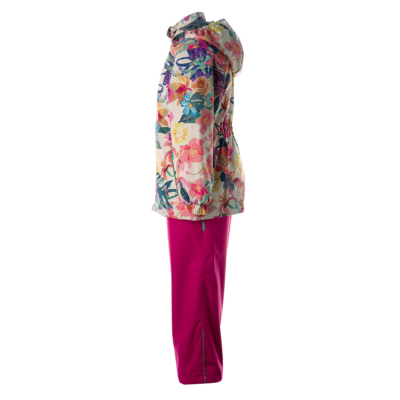 Children´s transition season jacket and pants set. Water- and windproof, breathable outer fabric. The inside of the jacket and trousers is made of soft lining fabric. Rubber band incorporated in the sleeve ends, hood edge, and back waist. The removable hood attaches to the collar with press studs. The trousers have a higher waist and adjustable elastic braces. incorporated rubber waistband. Rubber band tunnel with stoppers at the ends of the legs. Waterproof taped seat seam. The pants have no inseam on the leg. Both jackets and trousers have reflective details.