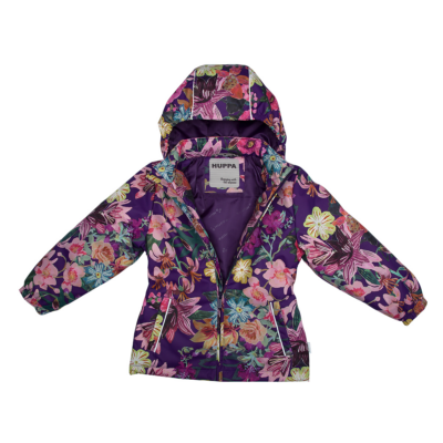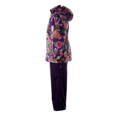 Children´s transition season jacket and pants set. Water- and windproof, breathable outer fabric. The inside of the jacket and trousers is made of soft lining fabric. Rubber band incorporated in the sleeve ends, hood edge, and back waist. The removable hood attaches to the collar with press studs. The trousers have a higher waist and adjustable elastic braces. incorporated rubber waistband. Rubber band tunnel with stoppers at the ends of the legs. Waterproof taped seat seam. The pants have no inseam on the leg. Both jackets and trousers have reflective details.