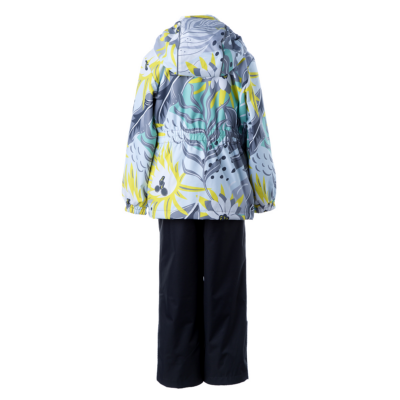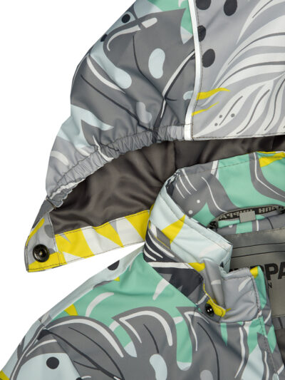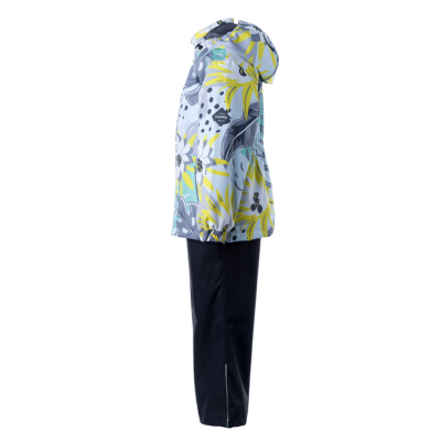 Children´s transition season jacket and pants set. Water- and windproof, breathable outer fabric. The inside of the jacket and trousers is made of soft lining fabric. Rubber band incorporated in the sleeve ends, hood edge, and back waist. The removable hood attaches to the collar with press studs. The trousers have a higher waist and adjustable elastic braces. incorporated rubber waistband. Rubber band tunnel with stoppers at the ends of the legs. Waterproof taped seat seam. The pants have no inseam on the leg. Both jackets and trousers have reflective details.