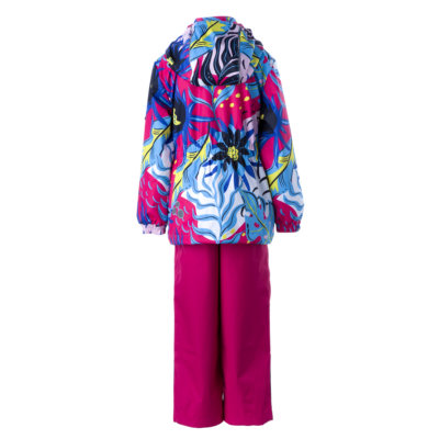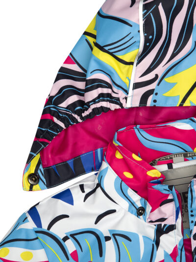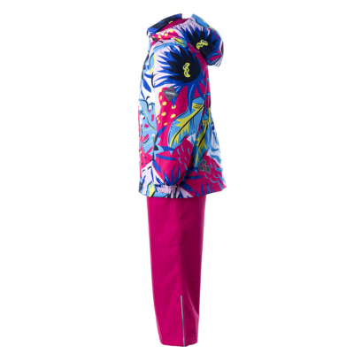 Children´s transition season jacket and pants set. Water- and windproof, breathable outer fabric. The inside of the jacket and trousers is made of soft lining fabric. Rubber band incorporated in the sleeve ends, hood edge, and back waist. The removable hood attaches to the collar with press studs. The trousers have a higher waist and adjustable elastic braces. incorporated rubber waistband. Rubber band tunnel with stoppers at the ends of the legs. Waterproof taped seat seam. The pants have no inseam on the leg. Both jackets and trousers have reflective details.