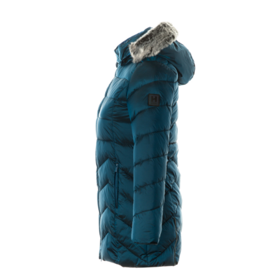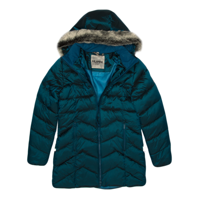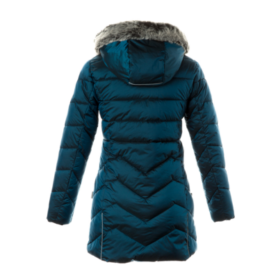 Children’s waterproof and windproof quilted winter coat. Breathable fabric. Soft lining on the inside. Removable snap-on hood. The coat is filled with innovative recycled material imitating the properties of feather fill. The material is warm, dries quickly and does not clump after washing. A great to natural feather fill. Removable faux fur trim on hood. Two zippered pockets at front for gloves or other necessities. Reflective elements on fabric.