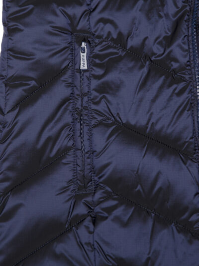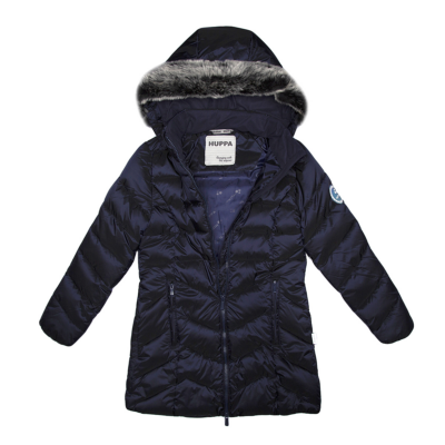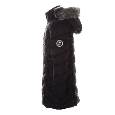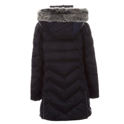 Children’s waterproof and windproof quilted winter coat. Breathable fabric. Soft lining on the inside. Removable snap-on hood. The coat is filled with innovative recycled material imitating the properties of feather fill. The material is warm, dries quickly and does not clump after washing. A great to natural feather fill. Removable faux fur trim on hood. Two zippered pockets at front for gloves or other necessities. Reflective elements on fabric.