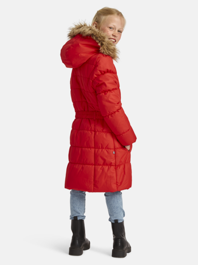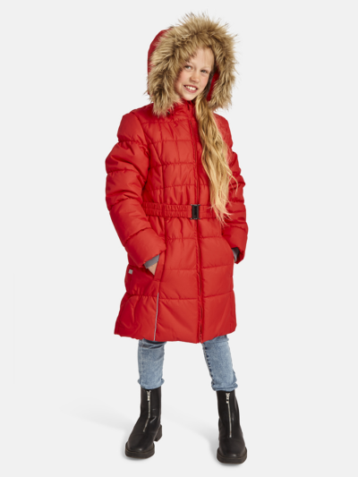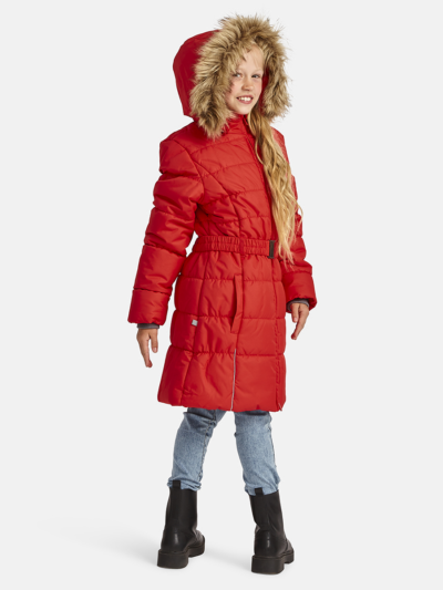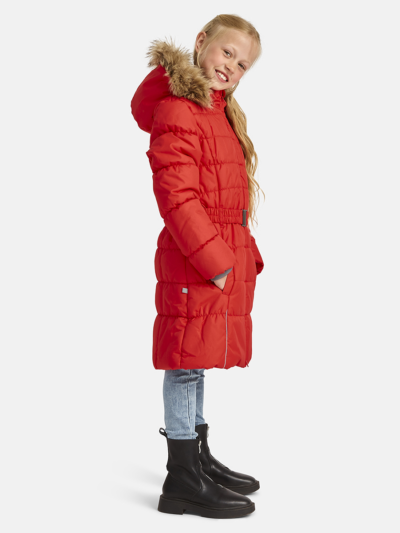 Children’s waterproof and windproof winter coat Breathable fabric Soft lining on the inside Removable snap-on hood Ribbed cuffs at sleeve ends Two-way zipper at front Faux fur trim on hood Reflective elements on fabric