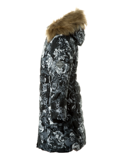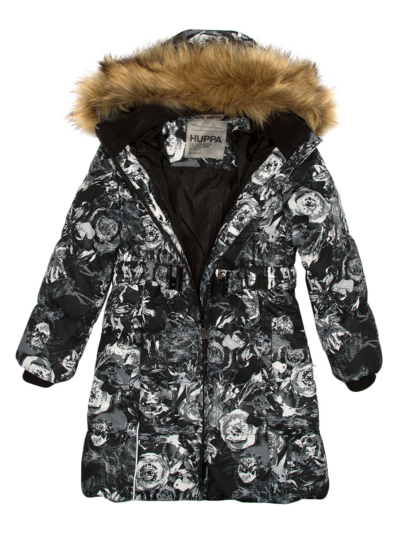 Children’s waterproof and windproof winter coat Breathable fabric Soft lining on the inside Removable snap-on hood Ribbed cuffs at sleeve ends Two-way zipper at front Faux fur trim on hood Reflective elements on fabric