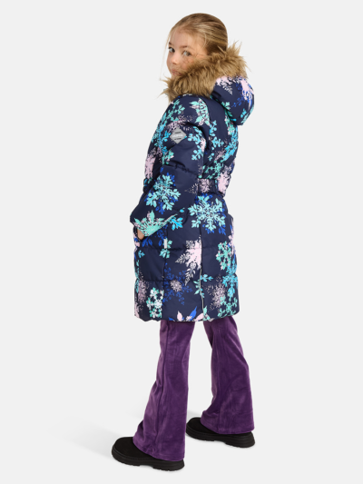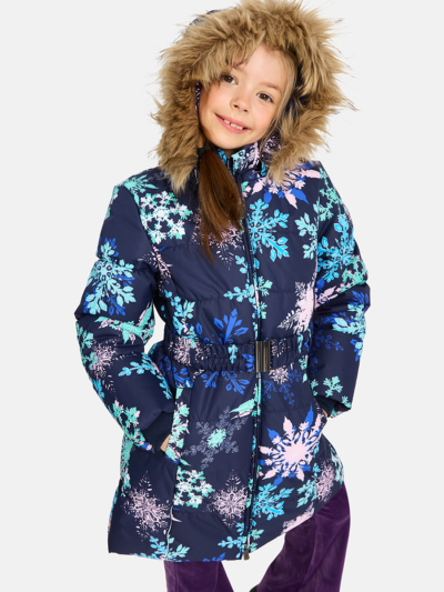 Children’s waterproof and windproof winter coat Breathable fabric Soft lining on the inside Removable snap-on hood Ribbed cuffs at sleeve ends Two-way zipper at front Faux fur trim on hood Reflective elements on fabric