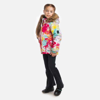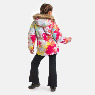 Girls’ 300g insulated winter jacket. The jacket has a soft flannel lining, and the outer fabric is both windproof and waterproof. Ribbed inner cuffs in the sleeves keep the child warm and dry even during active play. Reflective details added to the jacket ensure safety in the dark. The detachable hood with faux fur is safe for outdoor play, as it is attached with snap buttons to prevent snagging.