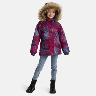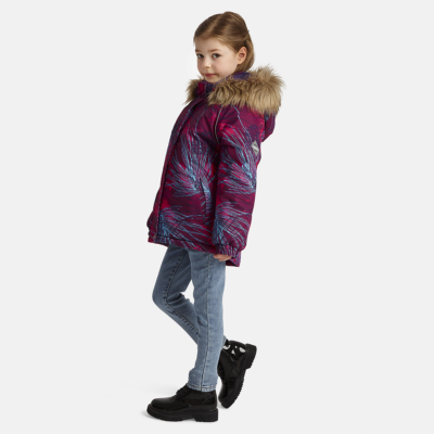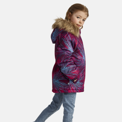 Children’s waterproof and windproof jacket. Breathable fabric. Soft mesh lining on the inside. Removable snap-on hood. Integrated elastic band at sleeve ends and on the waist. Zipper covered with stud-press flap at front. Integrated pockets at front. Faux fur trim on hood. Reflective elements on fabric.