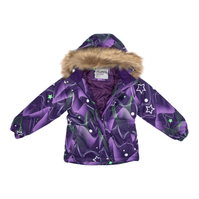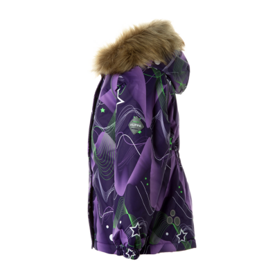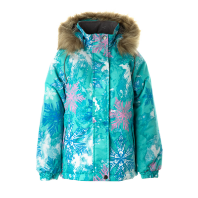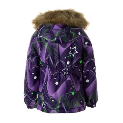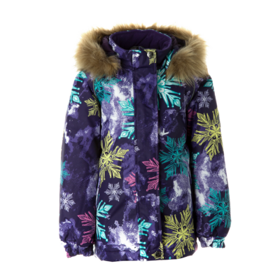 Children’s waterproof and windproof jacket Breathable fabric Soft mesh lining on the inside Removable snap-on hood Integrated elastic band at sleeve ends and on the waist Zipper covered with stud-press flap at front Integrated pockets at front Faux fur trim on hood Reflective elements on fabric