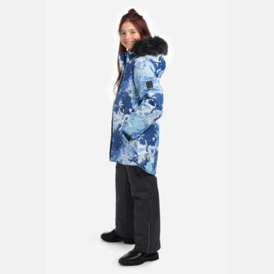 Children’s waterproof and windproof jacket. Breathable fabric. Soft mesh lining on the inside. Removable snap-on hood. Integrated elastic band at sleeve ends and on the waist. Zipper fastening. Integrated zipper pockets at front. Removable faux fur trim on hood. Reflective elements on fabric.