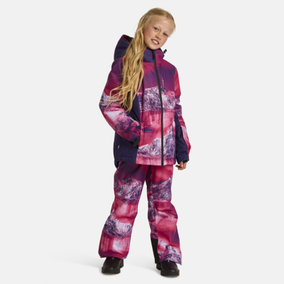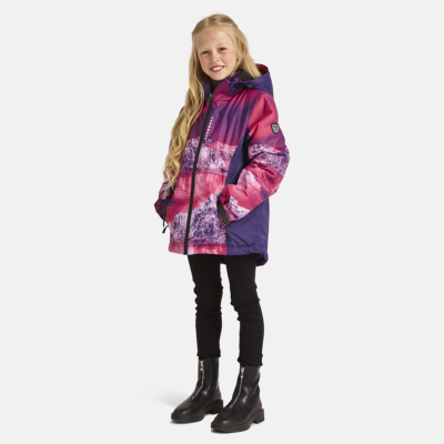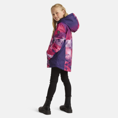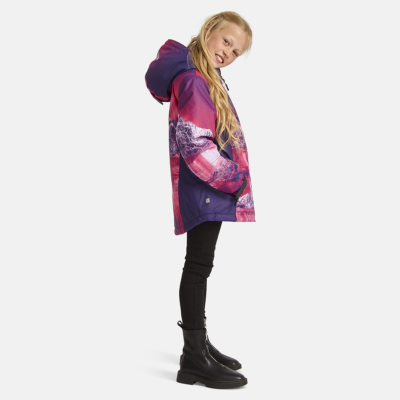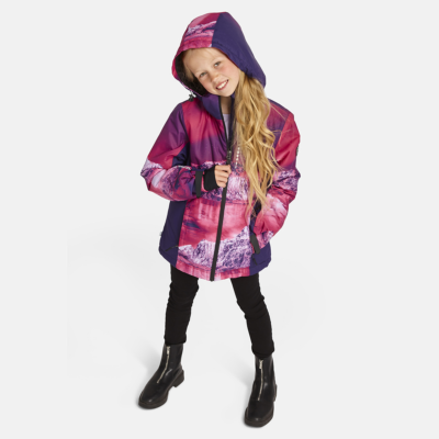 Children’s waterproof and windproof jacket Breathable fabric Soft mesh lining on the inside Powder skirt Integrated adjustable elastic band around the hood and on the back Waterproof zipper at front Integrated zippered pocket at front and on left sleeve Adjustable sleeve ends Cuffs with thumb holes at sleeve ends Waterproof taped seams Reflective elements on fabric
