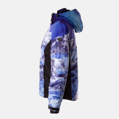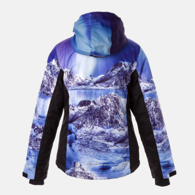 Children’s waterproof and windproof jacket Breathable fabric Soft mesh lining on the inside Powder skirt Integrated adjustable elastic band around the hood and on the back Waterproof zipper at front Integrated zippered pocket at front and on left sleeve Adjustable sleeve ends Cuffs with thumb holes at sleeve ends Waterproof taped seams Reflective elements on fabric