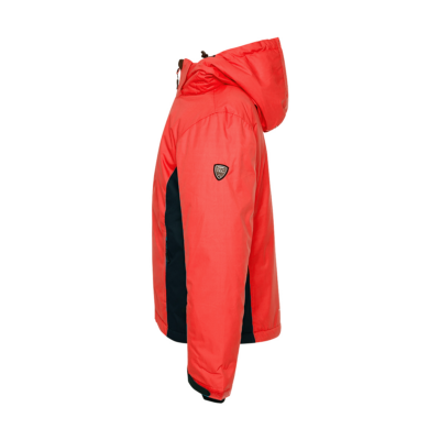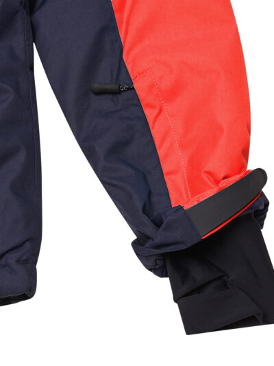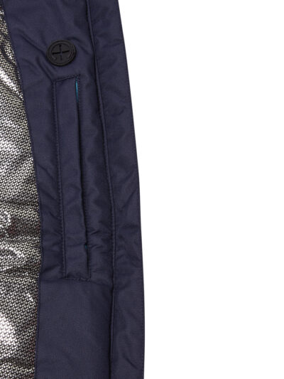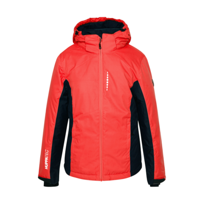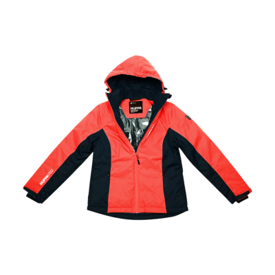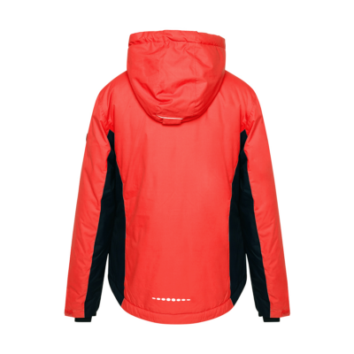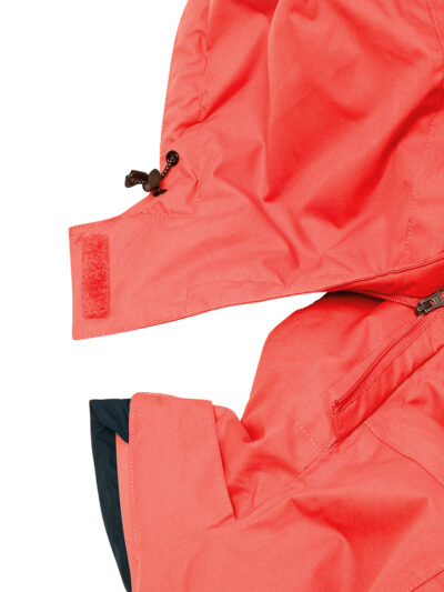 Children’s waterproof and windproof jacket Breathable fabric Soft mesh lining on the inside Powder skirt Integrated adjustable elastic band around the hood and on the back Waterproof zipper at front Integrated zippered pocket at front and on left sleeve Adjustable sleeve ends Cuffs with thumb holes at sleeve ends Waterproof taped seams Reflective elements on fabric