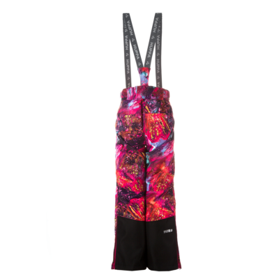 Children’s waterproof and windproof pants. Breathable fabric. Soft mesh lining on the inside of the pants. Adjustable removable braces. Adjustable waist. Integrated elastic band at the back of the waist. Integrated zippered pockets. Snow gaiters at leg ends. Zipper-adjustable leg end width. Waterproof taped seams. Reflective elements at the bottom.