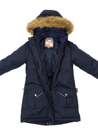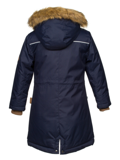 Windproof and waterproof parka with 300 g insulation. Ribbed inner cuffs and taped seams keep you warm and dry. Reflective details on the outer fabric. The removable hood is attached to the collar with snaps, and the fur trim is also removable. The parka has zippered front pockets and an adjustable waist from the inside.