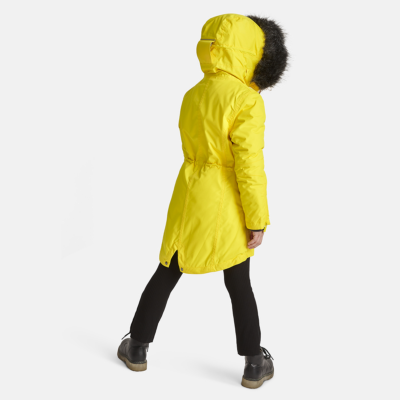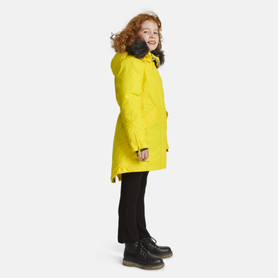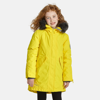 Children’s waterproof and windproof winter parka. Breathable fabric. Soft fabric on the inside. Faux sheepskin lining at the top of the back and inside the hood. Adjustable hood. Ribbed cuffs at sleeve ends. Two-way zipper covered with stud-press flap at front. Magnetic fastening on flap pockets. Drawstring tunnel with stoppers on waist. Waterproof taped seams. Removable faux fur trim on hood. Reflective elements on fabric.