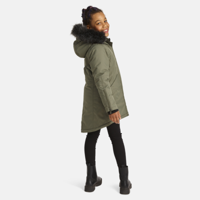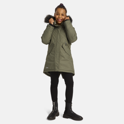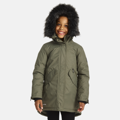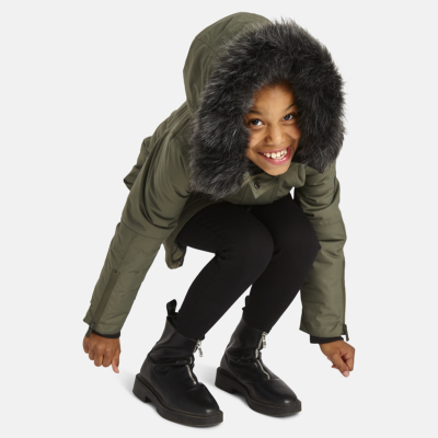 Children’s waterproof and windproof winter parka. Breathable fabric. Soft fabric on the inside. Faux sheepskin lining at the top of the back and inside the hood. Adjustable hood. Ribbed cuffs at sleeve ends. Two-way zipper covered with stud-press flap at front. Magnetic fastening on flap pockets. Drawstring tunnel with stoppers on waist. Waterproof taped seams. Removable faux fur trim on hood. Reflective elements on fabric.