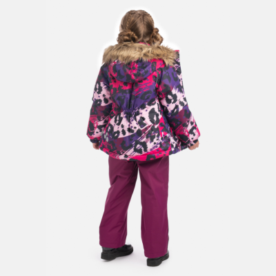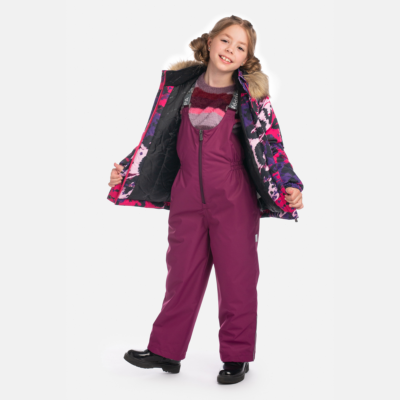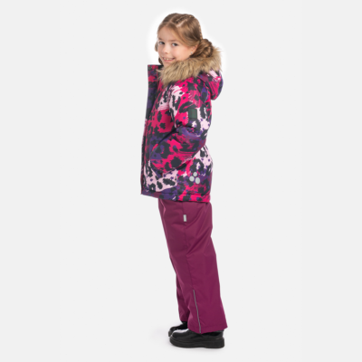 Children’s jacket and pants set. Waterproof and windproof, breathable top fabric. Soft mesh lining on the inside of the jacket and pants. Integrated elastic band at sleeve ends and on the waist. Removable snap-on hood Faux fur trim on hood. The bib pants have elastic adjustable braces. Integrated elastic band on waist. Drawstring tunnel with stoppers at leg ends. Waterproof taped seams. The pants have no inner leg seam. Reflective elements on both jacket and pants.