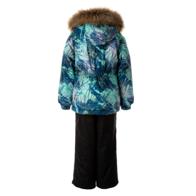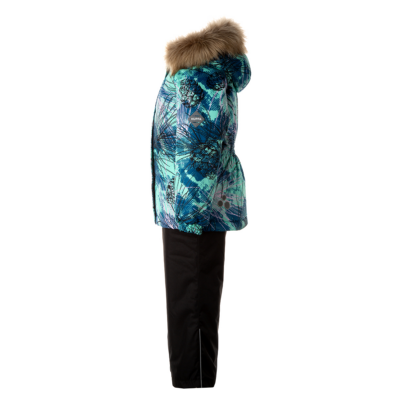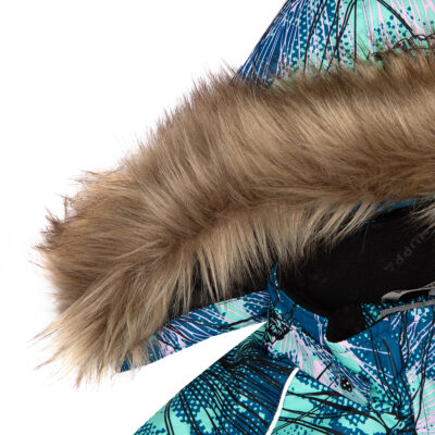 Children’s jacket and pants set. Waterproof and windproof, breathable top fabric. Soft mesh lining on the inside of the jacket and pants. Integrated elastic band at sleeve ends and on the waist. Removable snap-on hood Faux fur trim on hood. The bib pants have elastic adjustable braces. Integrated elastic band on waist. Drawstring tunnel with stoppers at leg ends. Waterproof taped seams. The pants have no inner leg seam. Reflective elements on both jacket and pants.