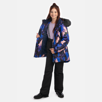 Children’s jacket and pants set. Waterproof and windproof, breathable top fabric. Soft mesh lining on the inside of the jacket and pants. Integrated elastic band at sleeve ends and on the waist. Removable snap-on hood. Removable faux fur trim on hood. The bib pants have elastic adjustable braces. Integrated elastic band on waist. Snow gaiters at leg ends. Drawstring tunnel with stoppers at leg ends. Waterproof taped seams. The pants have no inner leg seam. Reflective elements on both jacket and pants.