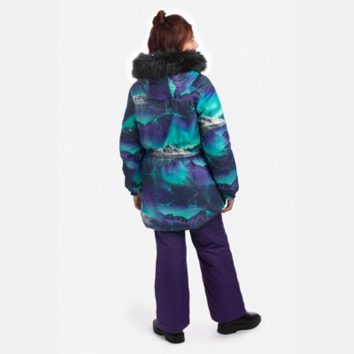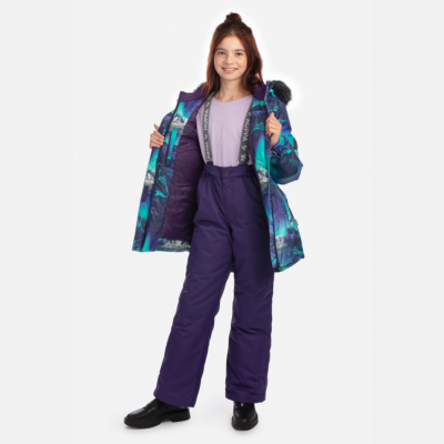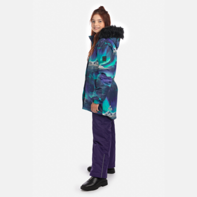 Children’s jacket and pants set. Waterproof and windproof, breathable top fabric. Soft mesh lining on the inside of the jacket and pants. Integrated elastic band at sleeve ends and on the waist. Removable snap-on hood. Removable faux fur trim on hood. The bib pants have elastic adjustable braces. Integrated elastic band on waist. Snow gaiters at leg ends. Drawstring tunnel with stoppers at leg ends. Waterproof taped seams. The pants have no inner leg seam. Reflective elements on both jacket and pants.
