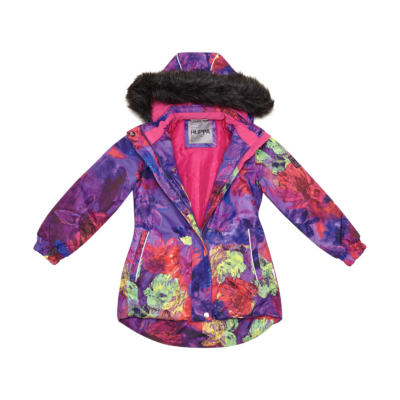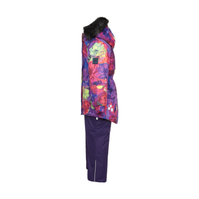 Children’s jacket and pants set. Waterproof and windproof, breathable top fabric. Soft mesh lining on the inside of the jacket and pants. Integrated elastic band at sleeve ends and on the waist. Removable snap-on hood. Removable faux fur trim on hood. The pants have removable elastic and adjustable braces. Integrated elastic band on waist. Snow gaiters at leg ends. Drawstring tunnel with stoppers at leg ends. Waterproof taped seams. Reflective elements on both jacket and pants.