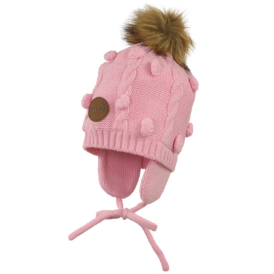 Children´s winter knitted hat. The lining of the hat is made of cotton jersey and the top is made of acrylic yarn. For more comfortable wearing, the hat has laces and small flaps that protect the ears.