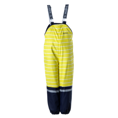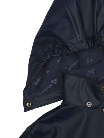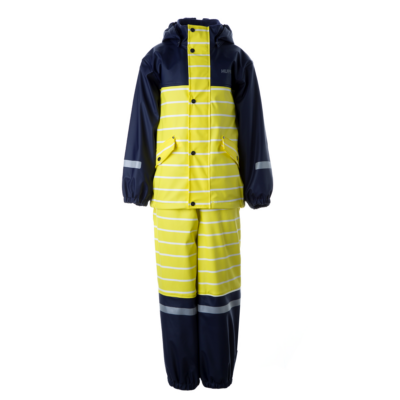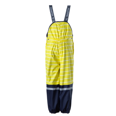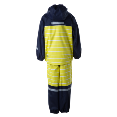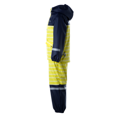Kids´ water- and windproof rain set. The inner lining of the rain set is made of a soft fleece material. It has sewn-in elastic bands on the sleeves, ankles and hood. The detachable hood can be attached to the collar with snap fasteners. Welded seams keep the set dry. The pants are high-waisted and have adjustable elastic suspenders. The set includes elastic foot straps. It is decorated with reflective details.
