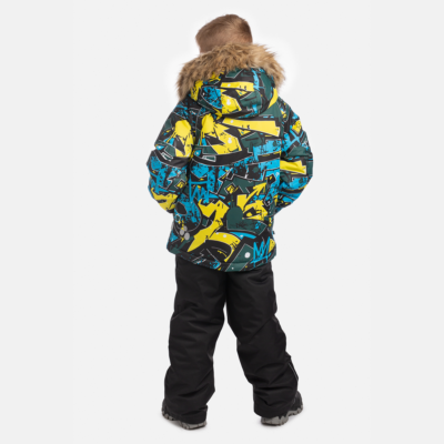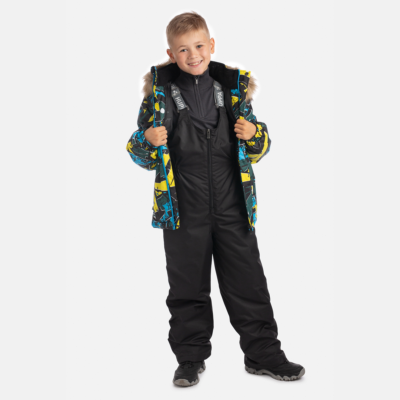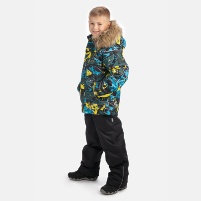 Children’s jacket and pants set. Waterproof, windproof and breathable fabric. Soft lining on the inside of the jacket and pants. Integrated elastic band at sleeve ends and on the waist. Removable snap-on hood. Faux fur trim on hood. The bib-pants have elastic adjustable suspenders. Integrated elastic band on waist. Drawstring tunnel with stoppers at leg ends. Waterproof taped seams. The pants have no inner leg seam. Reflective details on both jacket and pants.