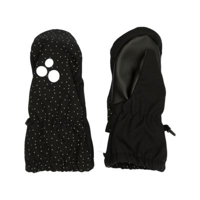 Kids´ windproof Softshell mittens. The mittens are decorated with a dotted reflective pattern. Comfortable integrated elastic band around the wrists. The inside of the mittens is made of a soft fleece material. The mittens are attached together by a small clasp and are decorated with reflective details.