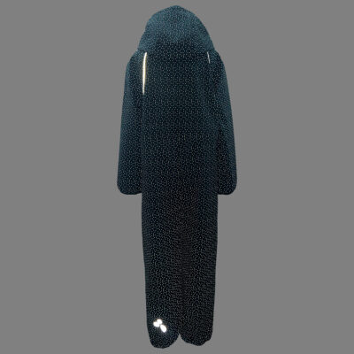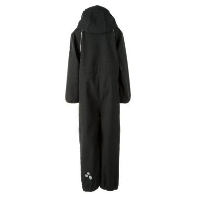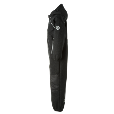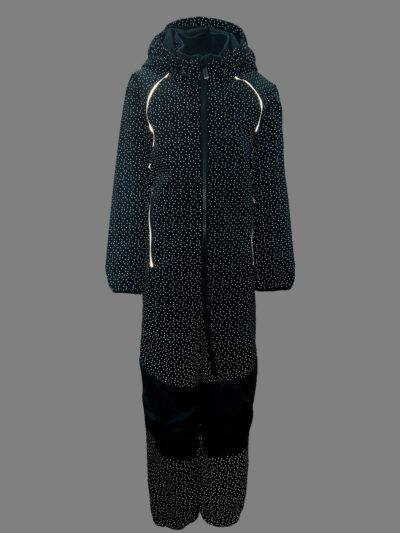 Children’s windproof Softshell overall. Dotted reflective print all over. Brushed soft on the inside. Integrated elastic band around the hood and at leg ends. Removable snap-on hood. Durable fabric on knees. Buttonhole-adjustable waist element on the back. Silicone foot straps.