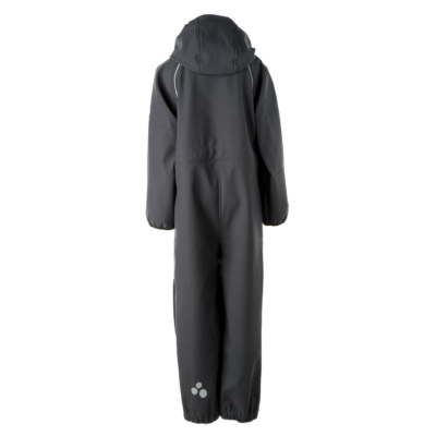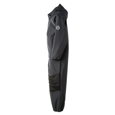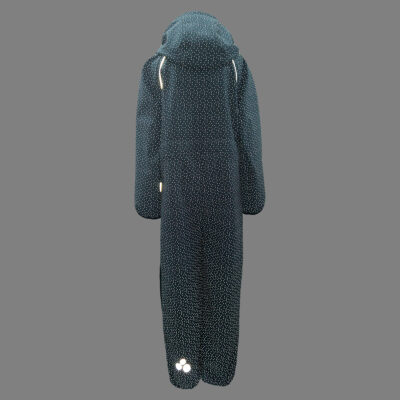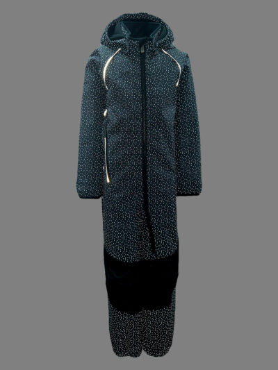 Children’s windproof Softshell overall. Dotted reflective print all over. Brushed soft on the inside. Integrated elastic band around the hood and at leg ends. Removable snap-on hood. Durable fabric on knees. Buttonhole-adjustable waist element on the back. Silicone foot straps.
