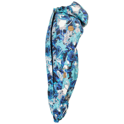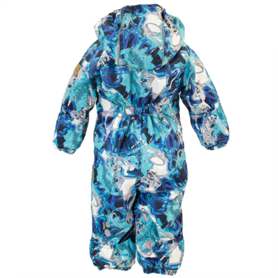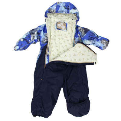 Children´s waterproof and windproof spring-autumn overalls. Breathable outer fabric. The inside of the overalls is made of flannel lining fabric. Rubber band incorporated at the ends of the sleeves and legs and at the edge of the hood. The removable hood attaches to the collar with press studs. Comfortably reversible sleeve and leg ends. Rubber band incorporated in the waste on the back. Waterproof taped seams. The overalls have no inseam on the leg. Removable rubber soles. Reflective details on the outer fabric.