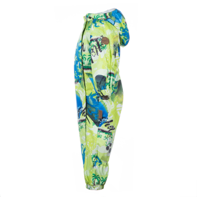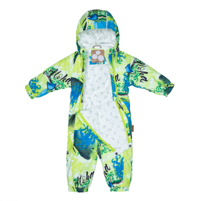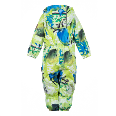 Children´s waterproof and windproof spring-autumn overalls. Breathable outer fabric. The inside of the overalls is made of flannel lining fabric. Rubber band incorporated at the ends of the sleeves and legs and at the edge of the hood. The removable hood attaches to the collar with press studs. Comfortably reversible sleeve and leg ends. Rubber band incorporated in the waste on the back. Waterproof taped seams. The overalls have no inseam on the leg. Removable rubber soles. Reflective details on the outer fabric.