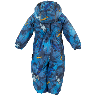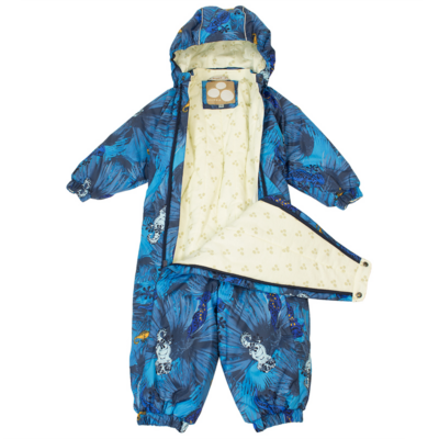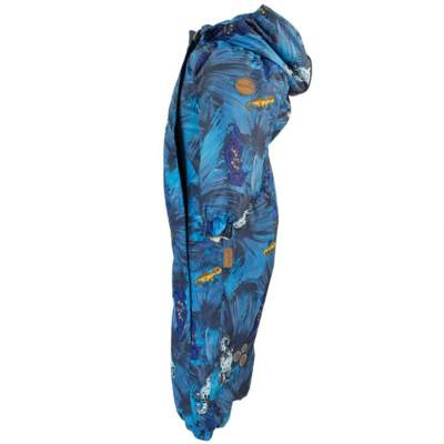Children´s waterproof and windproof spring-autumn overalls. Breathable outer fabric. The inside of the overalls is made of flannel lining fabric. Rubber band incorporated at the ends of the sleeves and legs and at the edge of the hood. The removable hood attaches to the collar with press studs. Comfortably reversible sleeve and leg ends. Rubber band incorporated in the waste on the back. Waterproof taped seams. The overalls have no inseam on the leg. Removable rubber soles. Reflective details on the outer fabric.