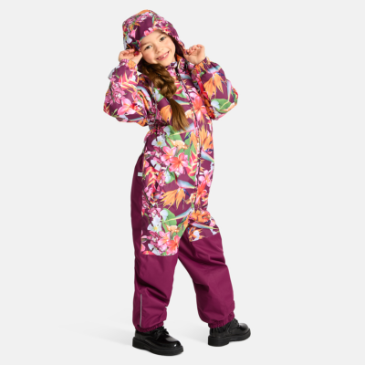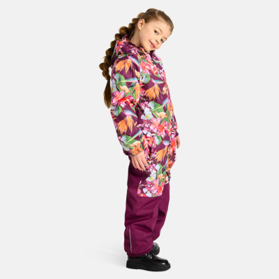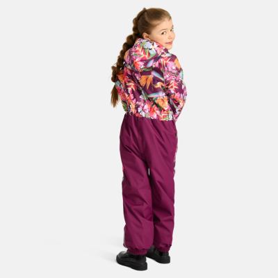 Insulated (40 g) water- and windproof overall for kids, suitable for spring and autumn. The top layer of the overall is made of a breathable material. It has sewn-in elastic bands on the sleeves, ankles and hood. The detachable hood can be attached to the collar with snap fasteners. The overall has a sewn-in buttonhole elastic on the waistline and waterproof, taped seams. The set includes elastic foot straps. It is decorated with reflective details.