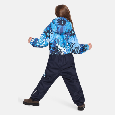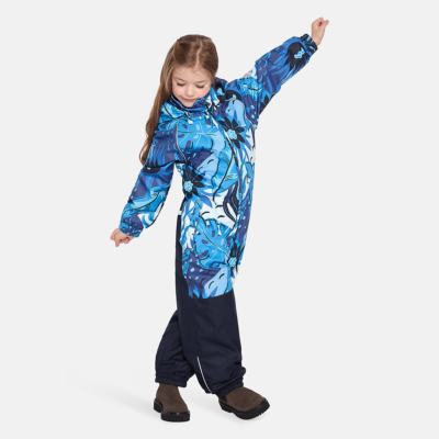Insulated (40 g) water- and windproof overall for kids, suitable for spring and autumn. The top layer of the overall is made of a breathable material. It has sewn-in elastic bands on the sleeves, ankles and hood. The detachable hood can be attached to the collar with snap fasteners. The overall has a sewn-in buttonhole elastic on the waistline and waterproof, taped seams. The set includes elastic foot straps. It is decorated with reflective details.