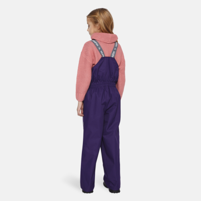 Children´s high-waisted trousers. The trousers are waterproof and windproof. Breathable outer fabric. The inside of the trousers is made of soft lining fabric. Adjustable elastic braces. incorporated rubber waistband. Rubber band tunnel with stoppers at the ends of the legs. Waterproof taped seat seam. The pants have no inseam on the leg. Reflective details on the outer fabric.
