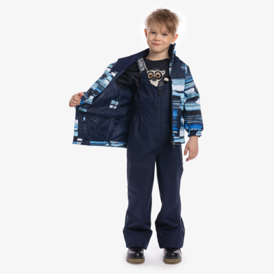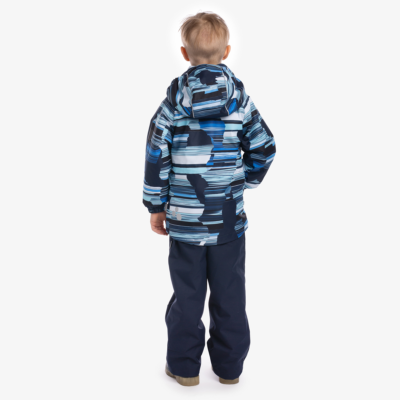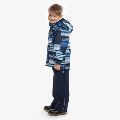 Children´s transition season jacket and pants set. Water- and windproof, breathable outer fabric. The inside of the jacket and trousers is made of soft lining fabric. Rubber band incorporated in the sleeve ends, hood edge, and back waist. The removable hood attaches to the collar with press studs. The trousers have a higher waist and adjustable elastic braces. incorporated rubber waistband. Waterproof taped seat seam. Both jackets and trousers have reflective details.