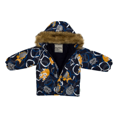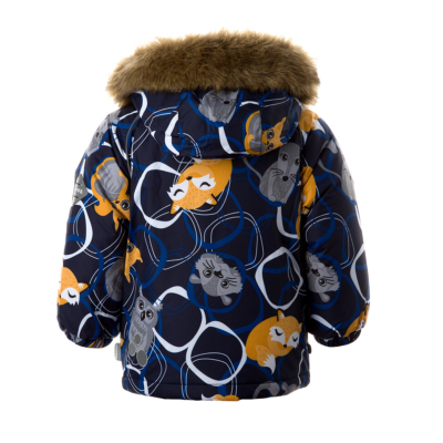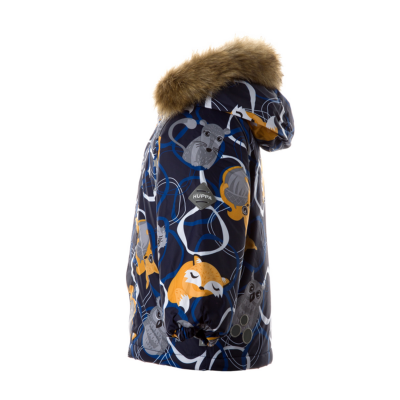 Children’s waterproof and windproof jacket Breathable fabric Soft mesh lining on the inside Removable snap-on hood Integrated elastic band at sleeve ends Zipper covered with stud-press flap at front Integrated pockets at front Faux fur trim on hood Reflective elements on fabric