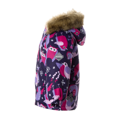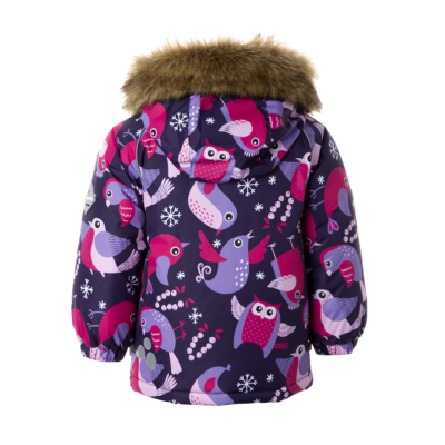 Children’s waterproof and windproof jacket Breathable fabric Soft mesh lining on the inside Removable snap-on hood Integrated elastic band at sleeve ends Zipper covered with stud-press flap at front Integrated pockets at front Faux fur trim on hood Reflective elements on fabric