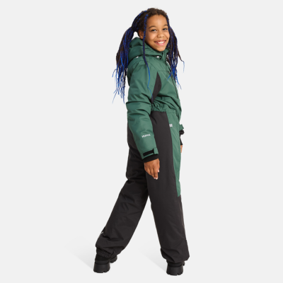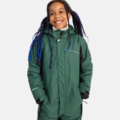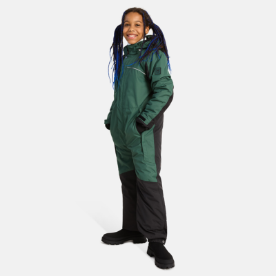 Children’s water- and windproof overalls with 200 g insulation. Breathable outer fabric. Soft lining fabric inside. Detachable hood. Adjustable elastic rubber band at the edge and back of the hood. Ribbed cuffs on sleeves. Adjustable sleeve cuffs. Front zipper with placket. Front zipper pockets and zipper breast pocket. Elastic waistband with buttonholes. Leg part in durable Cordura fabric. Waterproof taped seams. Reflective detailing on outer fabric.