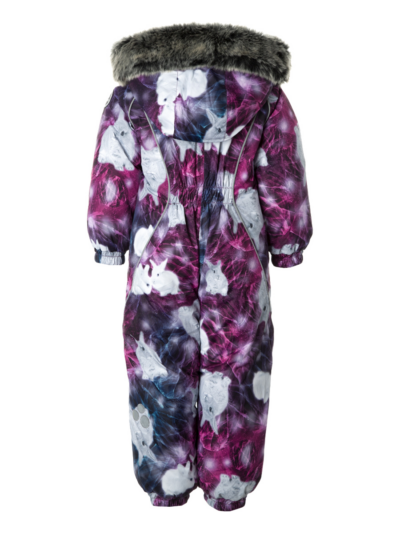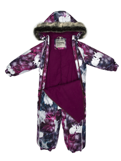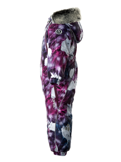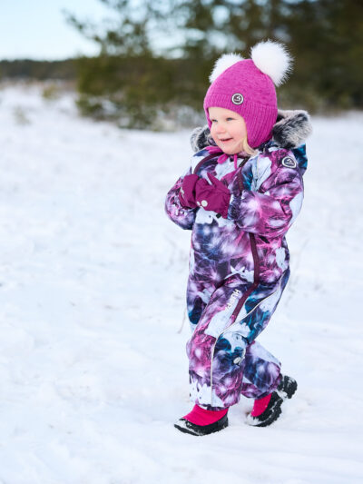 Babies’ modern waterproof and windproof winter overall. Breathable fabric. Flannel lining on the inside. Integrated elastic band at sleeve and leg ends and at waist on the back. The removable snap-on hood is safe for when the child gets stuck when playing outside. Sleeve and leg ends can be conveniently rolled down in sizes 68–80. Waterproof taped seams. The product comes with both silicone and rubber foot straps. Faux fur trim on hood. The high-performance top fabric is great to wear for children in any winter weather. The insides of leg ends are also covered with the main fabric to keep the child dry. Numerous reflective elements on the top fabric ensure visibility from all sides in the dark winter time.